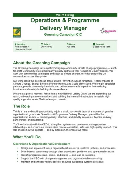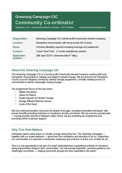 The local greening campaign has two full time roles for help with the local greening campaign helping residents to reduce their energy use and cut their bills. I have been passed the following information and present as/is. Any questions, please direct them to the Greening Campaign, details below.